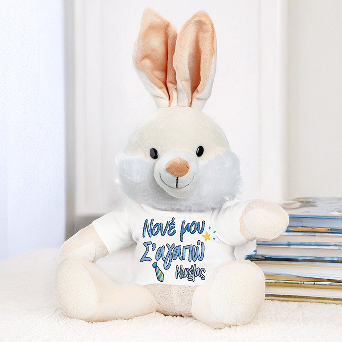 Λούτρινο λαγουδάκι με λευκό T-Shirt τυπωμένο με το μήνυμα της επιλογής σου, για να χαρίσεις στο νονό σου για το Πάσχα και να του δείξεις πόσο σημαντικός είναι για σένα!