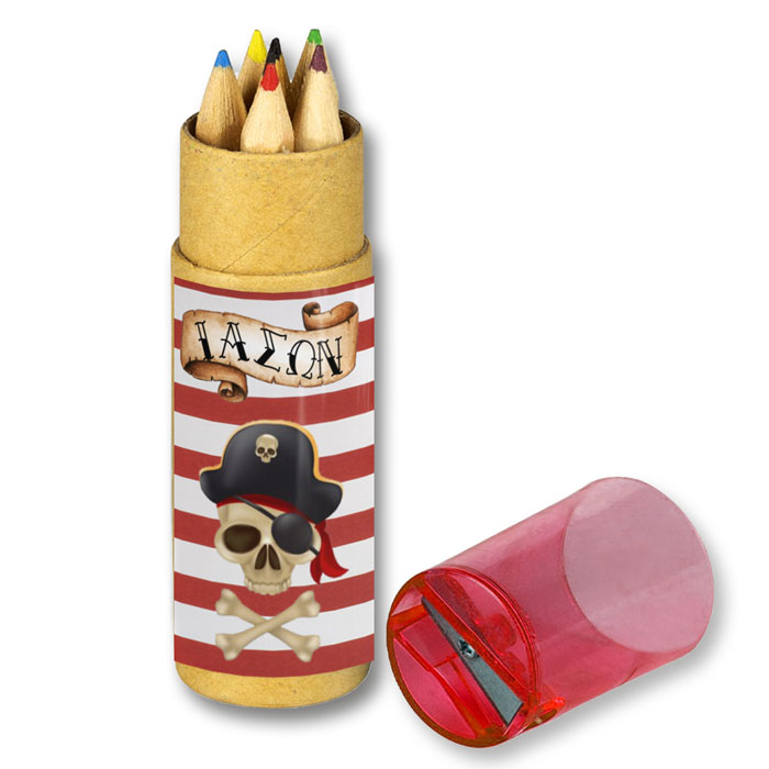 Προσωποποιημένες ξυλομπογιές σε κραφτ κουτάκι με θέμα Πειρατές, για να χαρίσετε στους καλεσμένους του πάρτυ.