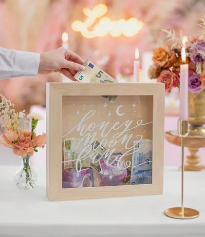 Ένας ευφάνταστος και χιουμοριστικός τρόπος για να συλλέξετε τα φακελάκια των καλεσμένων στο γάμο! Ξύλινο κάδρο-κουμπαράς με λευκή εκτύπωση “”Honeymoon Fund””.