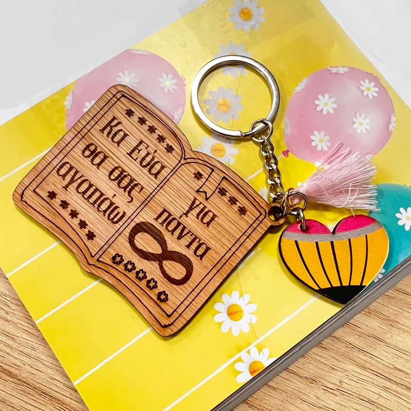 - Το μπρελόκ είναι από ξύλο και φέρει χαραγμένο μήνυμα και σχέδιο