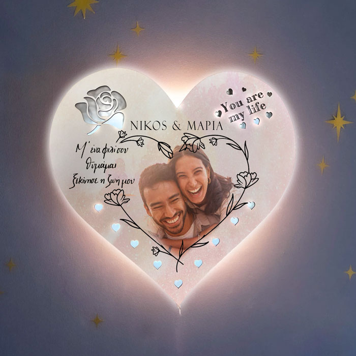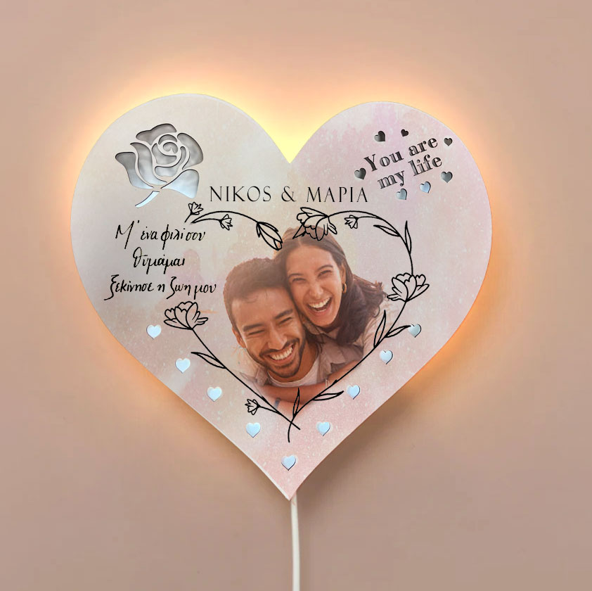 Εντυπωσιακό ξύλινο φωτιστικό αγάπης σε σχήμα καρδιάς με την αφιέρωση και τη φωτογραφία σας! Ένα μοναδικό δώρο για να χαρίσεις στο αγαπημένο σου πρόσωπο, που θα διακοσμεί το δωμάτιο και θα σε θυμίζει!