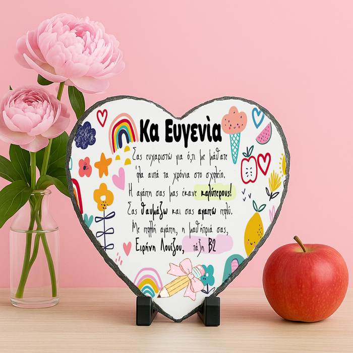 Εντυπωσιακή πέτρινη κορνίζα με αφιέρωση, ένα διαχρονικό δώρο που η δασκάλα σου θα θαυμάζει για πάντα! Σε αυτό το προϊόν φωτογραφίας, συνδυάζετε τη σύγχρονη τεχνολογία εκτύπωσης σε ένα κομμάτι φυσικής