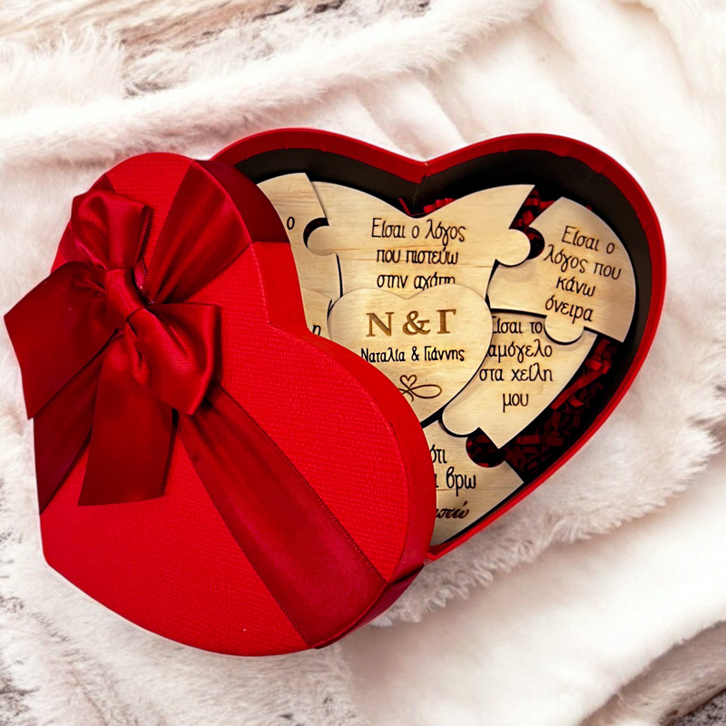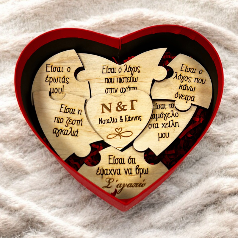 Ένα γλυκό δώρο για να κάνετε στο ταίρι σας: Κουτί που περιέχει Παζλ με ξύλινες καρδούλες που αναγράφουν “Λόγους που σ’ αγαπώ” και τα ονόματά σας!