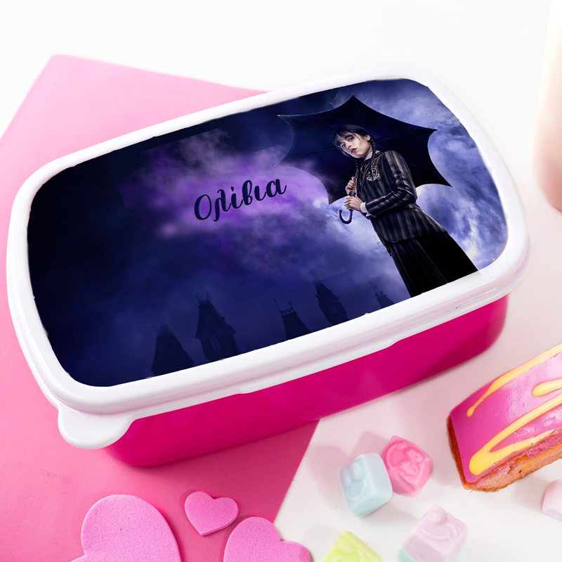 Παιδικό δοχείο φαγητού με την Wednesday με εκτυπωμένο όνομα της μικρής σας ώστε να το ξεχωρίζει στο σχολείο!