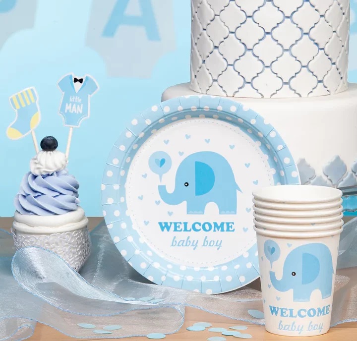 Πιάτα με γαλάζιο Ελεφαντάκι και μήνυμα Welcome Baby Boy, για το μπουφέ του Baby Shower ή της βάπτισης.