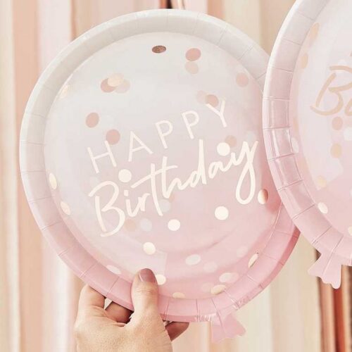 Ιδιαίτερα ροζ πιάτα φαγητού σε σχήμα μπαλόνι, με rose gold γράμματα Happy Birthday! Iδανικά για μια ιδιαίτερη διακόσμηση στο μπουφέ του πάρτυ γενεθλίων!
