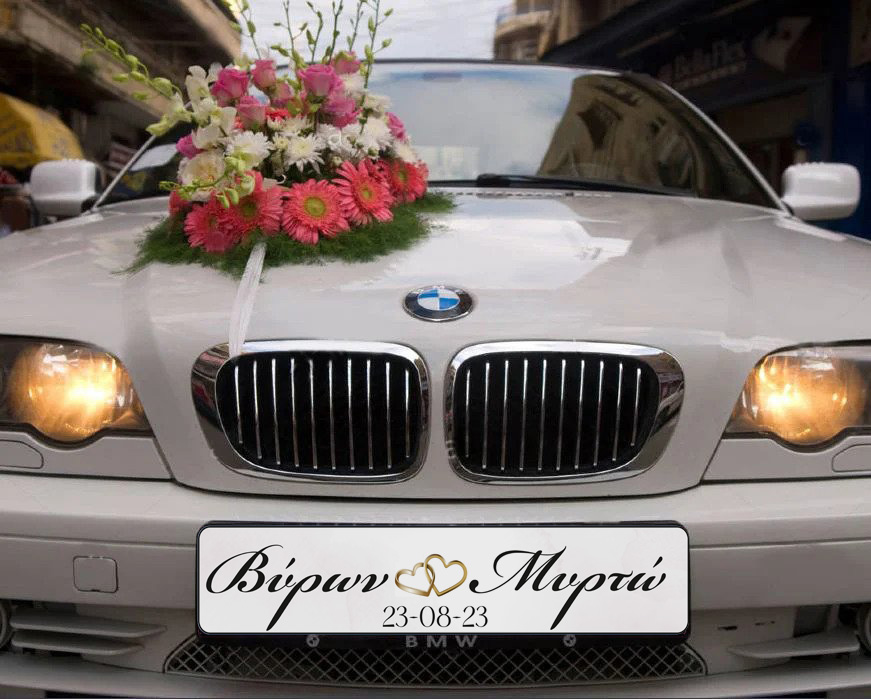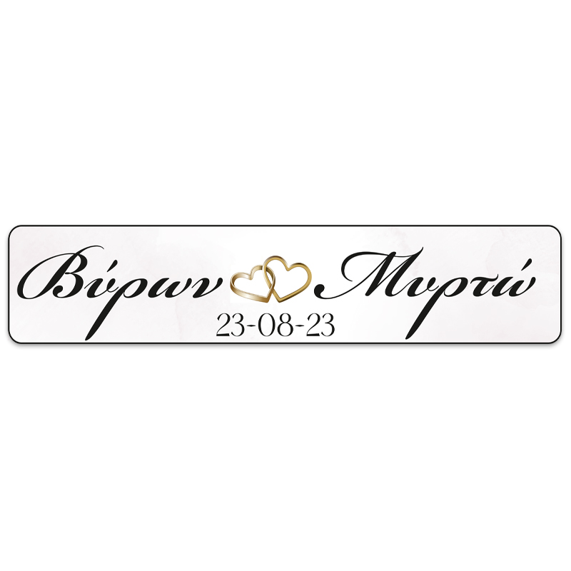 Πινακίδες αυτοκινήτου γάμου με τα ονόματα του ζευγαριού και τις χρυσές βέρες σε σχήμα καρδιάς που τα ενώνουν. Μια πρωτότυπη ιδέα για να στολίσετε το αυτοκίνητο του ζευγαριού για το γάμο!
