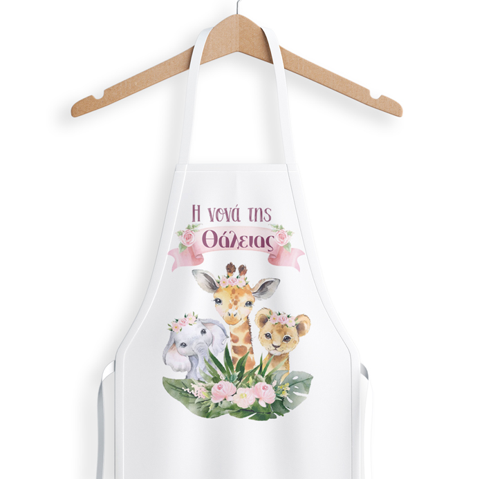 Προσωποποιημένη ποδιά με θέμα Ζώα της Ζούγκλας σε κοριτσίστικες αποχρώσεις για να την φορά ο νονός ή η νονά του μωρού σας στη βάπτιση του!
