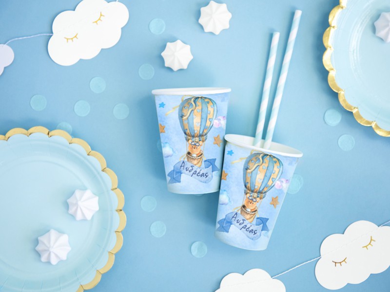 Ποτηράκια με το όνομα του μικρού σας και θέμα το Αερόστατο, για να κεράσετε τους καλεσμένους σας στο τραπέζι του πάρτυ ή της βάπτισης!