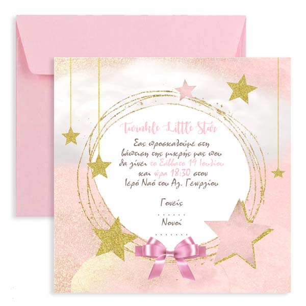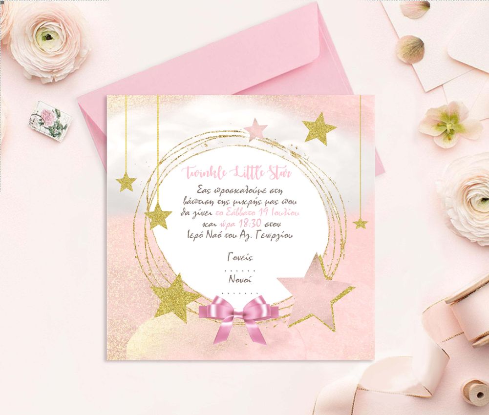 Τετράγωνο προσκλητήριο βάπτισης σε θέμα ροζ Αστεράκι, για να προσκαλέσετε τα αγαπημένα σας άτομα στην βάπτιση του μωρού σας.