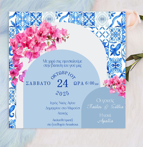 Προσκλητήριο Βάπτισης με θέμα Βουκαμβίλια, για να μοιράσετε στους αγαπημένους σας για τη βάπτιση του μικρού σας και να κλέψετε τις εντυπώσεις.
