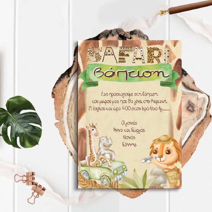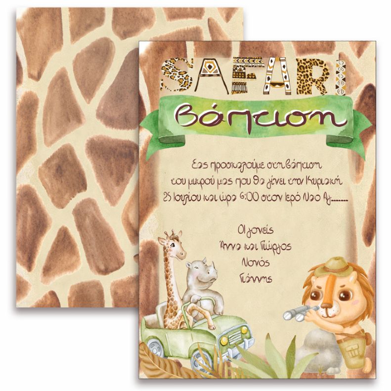 Μονόκαρτο προσκλητήριο με θέμα Σαφάρι και ζωάκια της ζούγκλας, για να καλέσετε τα αγαπημένα σας άτομα στη βάπτιση του μωρού σας!