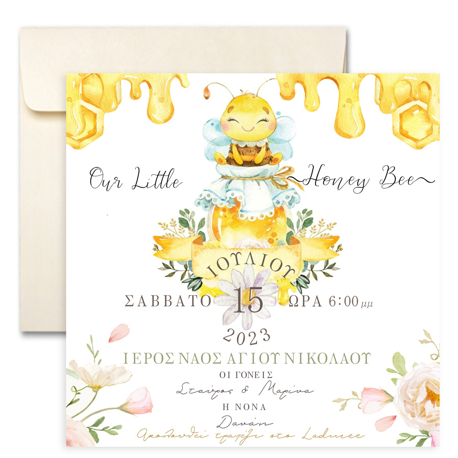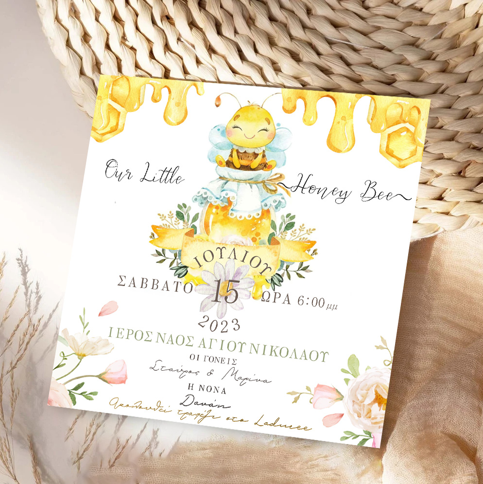 Προσκλητήριο βάπτισης με θέμα την πιο γλυκιά Μέλισσα για να μοιράσετε στα αγαπημένα σας πρόσωπα και να τα προσκαλέσετε στη βάπτιση του μωρού σας!