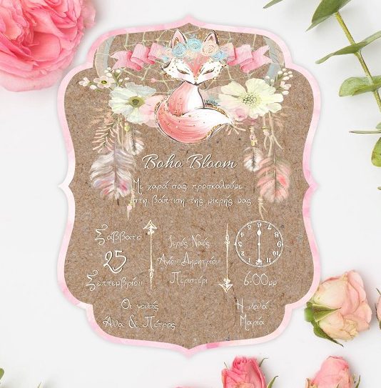 Εντυπωσιακό προσκλητήριο για τη βάπτιση του μωρού σας, σε σχηματικό μονόκαρτο με θέμα Boho Bloom!