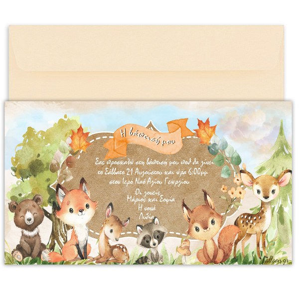Προσκλητήριο βάπτισης Woodland με φάκελο