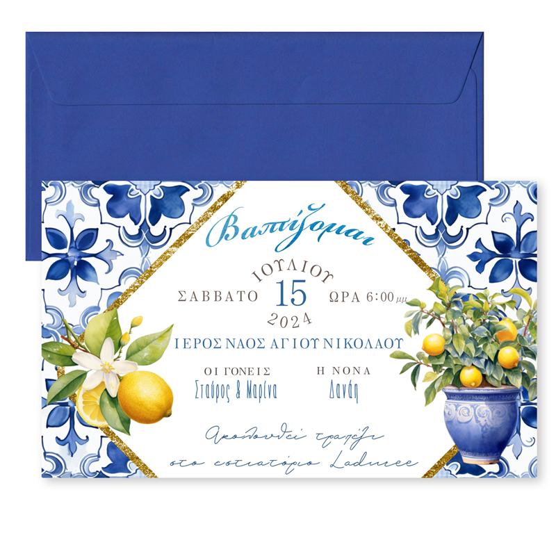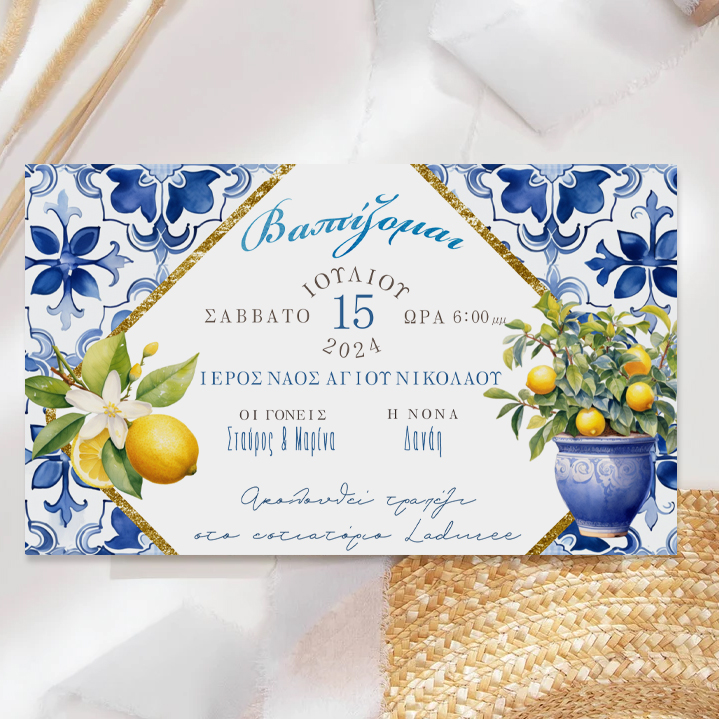 Προσκαλέστε τα αγαπημένα σας άτομα στη βάπτιση του μωρού σας με προσκλητήριο στο πιο μοδάτο θέμα Mediterranean Λεμόνι!