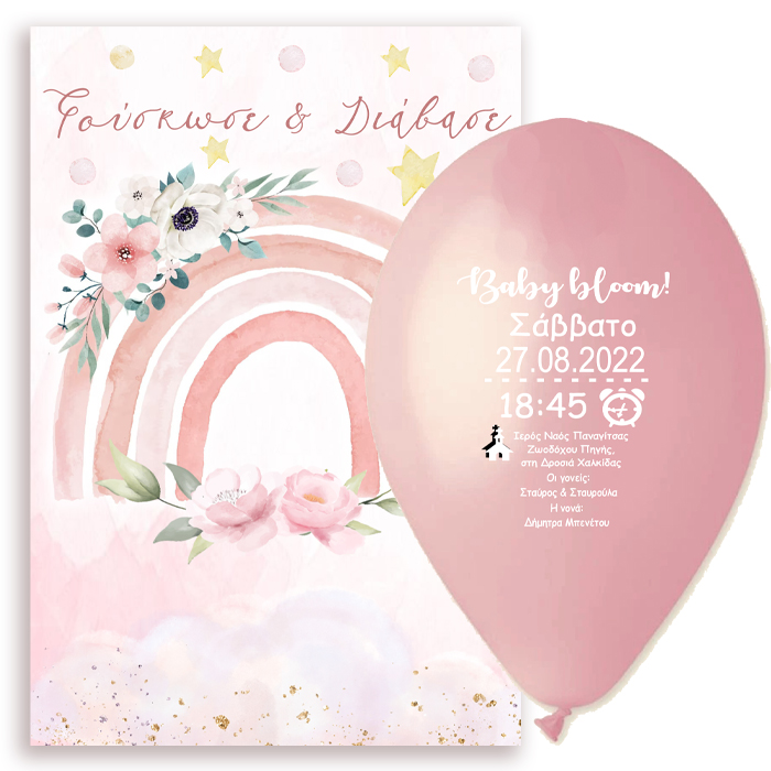 Πρωτότυπο προσκλητήριο βάπτισης σε τυπωμένο μπαλόνι με θέμα Ουράνιο Τόξο κορίτσι. Οι καλεσμένοι θα πρέπει να φουσκώσουν το τυπωμένο μπαλόνι για να μάθουν τις λεπτομέρειες της βάπτισης!