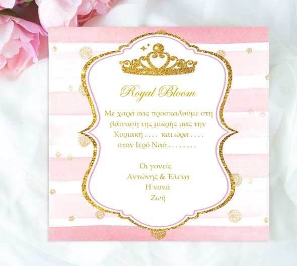 Τετράγωνο προσκλητήριο βάπτισης σε θέμα Royal Bloom, για να προσκαλέσετε τα αγαπημένα σας άτομα στην πριγκιπική βάπτιση της μικρής σας.