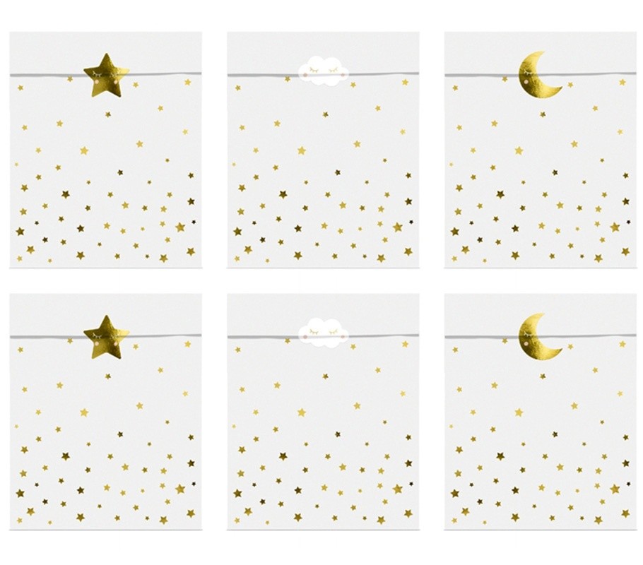 - 6 χάρτινες λευκές σακουλίτσες με χρυσά αστεράκια.