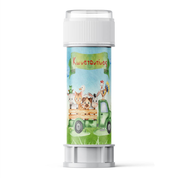 Χαρίστε ένα δωράκι στους μικρούς καλεσμένους του πάρτυ. Θεματικές σαπουνόφουσκες με τα ζωάκια της φάρμας που μπορούν να γράφουν επάνω το όνομα του παιδιού!