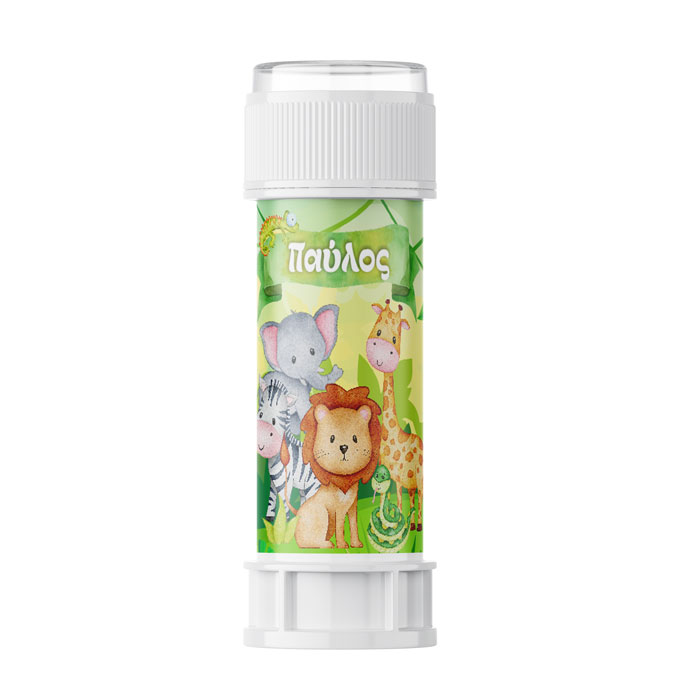 Χαρίστε ένα δωράκι στους μικρούς καλεσμένους. Θεματικές σαπουνόφουσκες με τα Ζωάκια της Ζούγκλας, που μπορούν να γράφουν το όνομα του παιδιού!