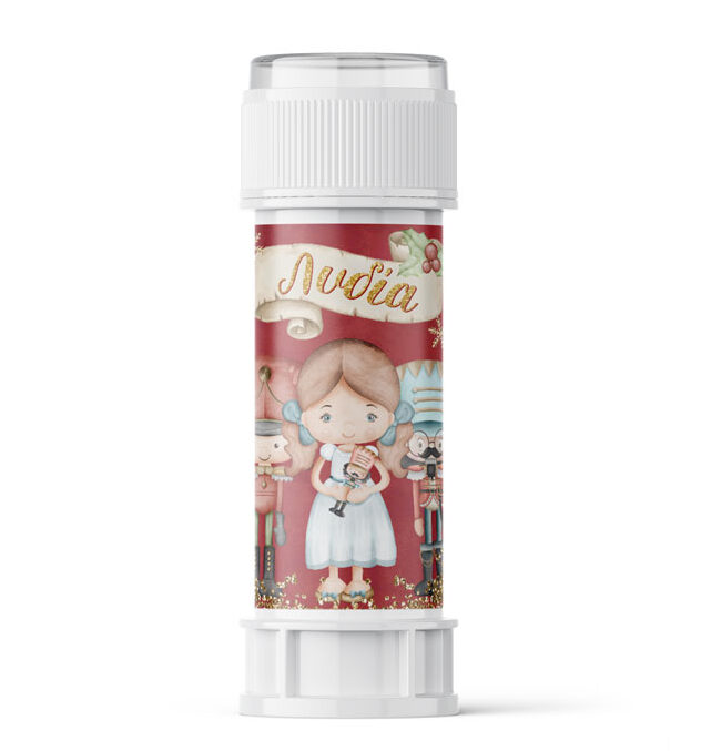 Προσωποποιημένες σαπουνόφουσκες με χάρτινο περιτύλιγμα με θέμα τον Καρυοθραύστη, για να χαρίσετε ως αναμνηστικό δωράκι στους μικρούς καλεσμένους του πάρτυ ή της βάπτισης.