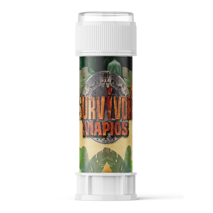 Προσωποποιημένες σαπουνόφουσκες με χάρτινο περιτύλιγμα και θέμα Survivor, για να χαρίσετε ως αναμνηστικό δωράκι στους μικρούς καλεσμένους του πάρτι.