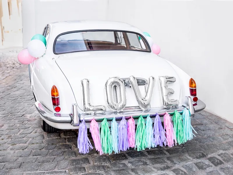 Δημιουργήστε μια υπέροχη διακόσμηση για το αυτοκίνητο στο γάμο με μπαλόνια LOVE και φούντες σε διάφορα χρώματα!