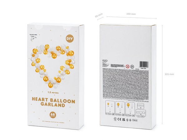 - Περιλαμβάνονται: 68 x μπαλόνια (22 x παστέλ λευκά, 23 x μεταλλικά λευκά, 24 x χρυσά), 16 x cardboard από χαρτόνι, 20 x αυτοκόλλητες ταινίες διπλής όψεως, οδηγίες.