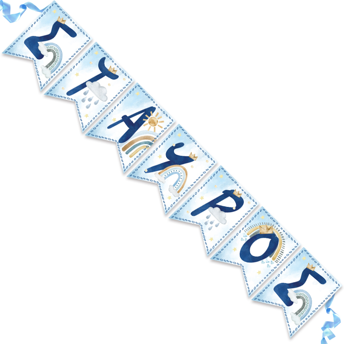 Διακοσμητικά σημαιάκια με το όνομα του παιδιού και θέμα Ουράνιο Τόξο σε αγορίστικες αποχρώσεις!