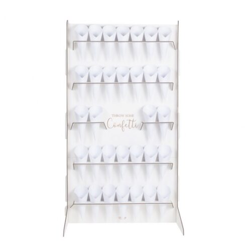 Σταντ – τοίχος με 32 θέσεις για χωνάκια και μήνυμα “”Throw some confetti””! Γέμισε τα χωνάκια με λουλούδια, ρύζι ή κομφετί, τοποθέτησε την βάση στο τραπέζι της δεξίωσης ή στο candy bar της εκκλησίας για να πάρουν οι καλεσμένοι!