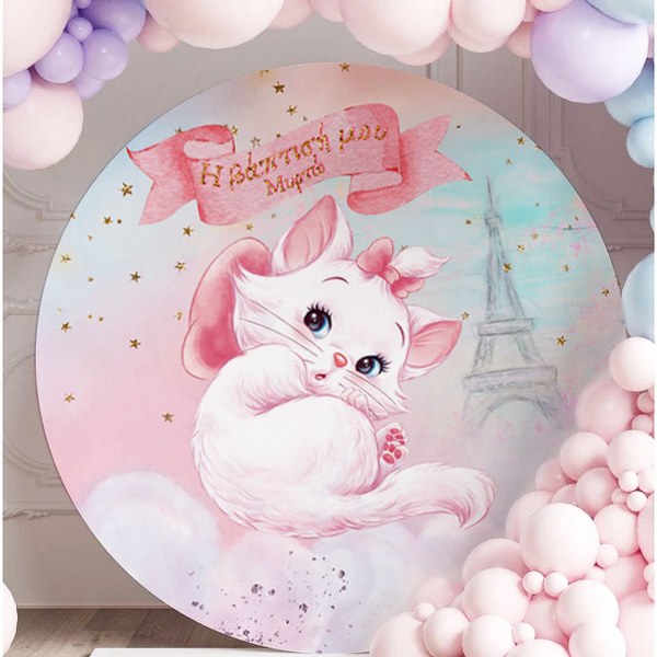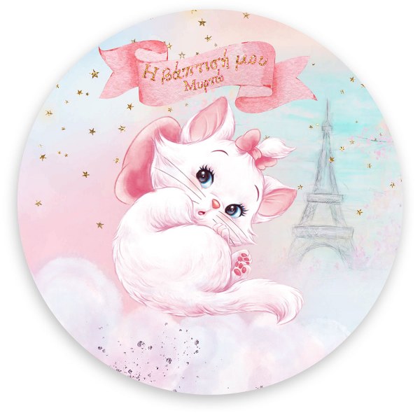 Στρογγυλή αφίσα με θέμα τη γλυκιά γατούλα Marie από τις Αριστόγατες και εκτυπωμένο το μήνυμα που θέλετε, για να διακοσμήσετε το χώρο της βάπτισης του μωρού σας!