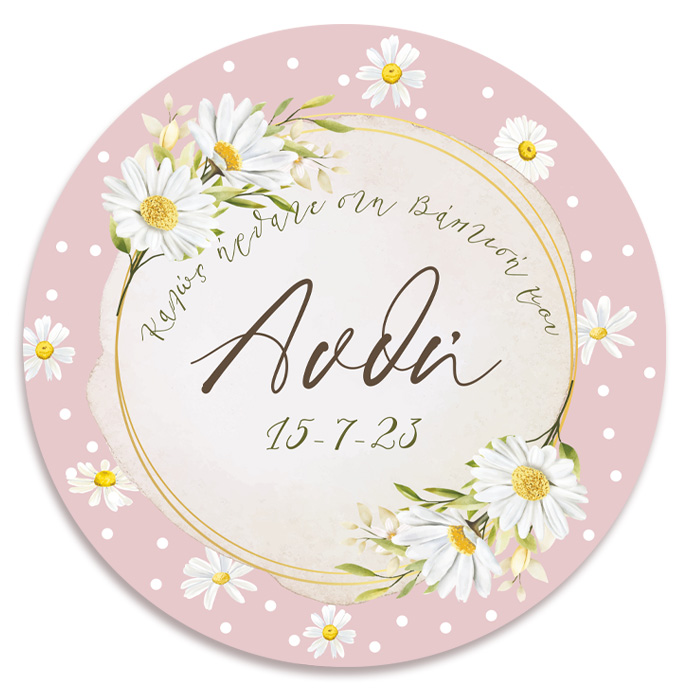 Στρογγυλή αφίσα με θέμα Μαργαρίτα και εκτυπωμένο το μήνυμα που θέλετε, για να διακοσμήσετε το χώρο της βάπτισης του μωρού σας!