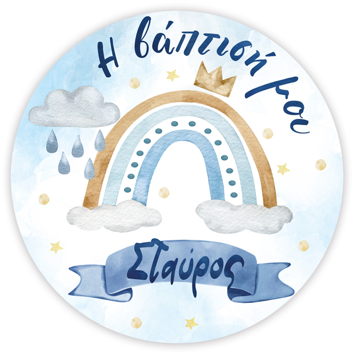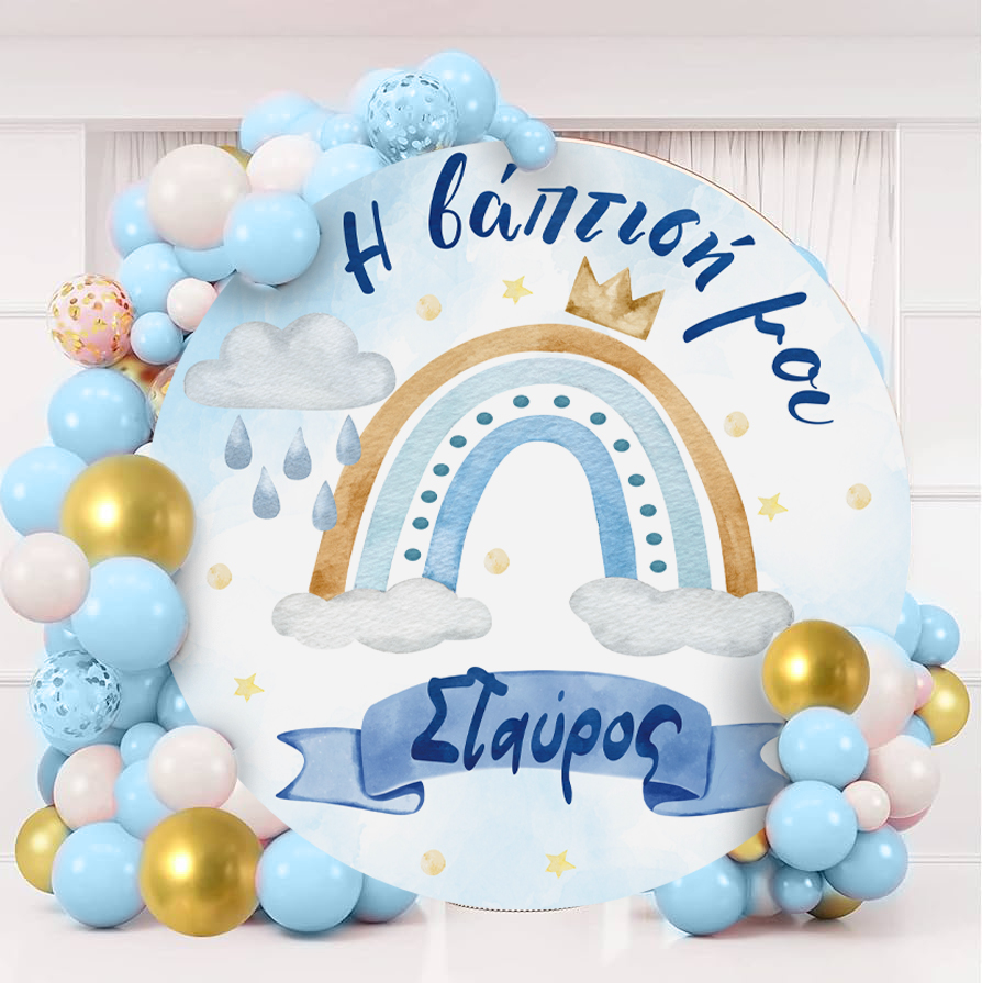 Στρογγυλή αφίσα με θέμα το Ουράνιο Τόξο σε αγορίστικες αποχρώσεις και εκτυπωμένο το μήνυμα που θέλετε, για να διακοσμήσετε το χώρο της βάπτισης της μικρής σας!