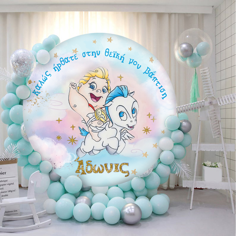 Στρογγυλή αφίσα με θέμα τον Ηρακλή μωρό και την παρέα του. Εκτυπώστε το μήνυμα που θέλετε και διακοσμήστε μοναδικά το χώρο της βάπτισης!