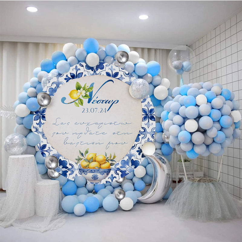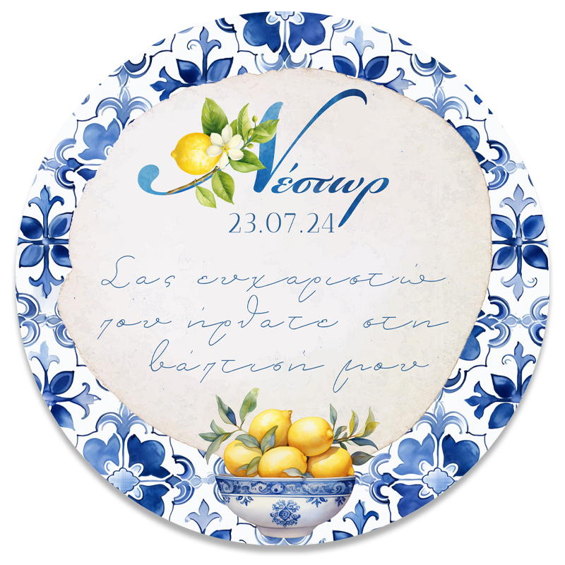 Στρογγυλή αφίσα με θέμα Mediterranean Λεμόνι και εκτυπωμένο το μήνυμα που θέλετε, για να διακοσμήσετε το χώρο της βάπτισης του μωρού σας!