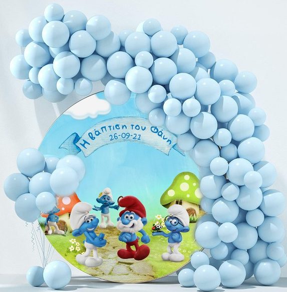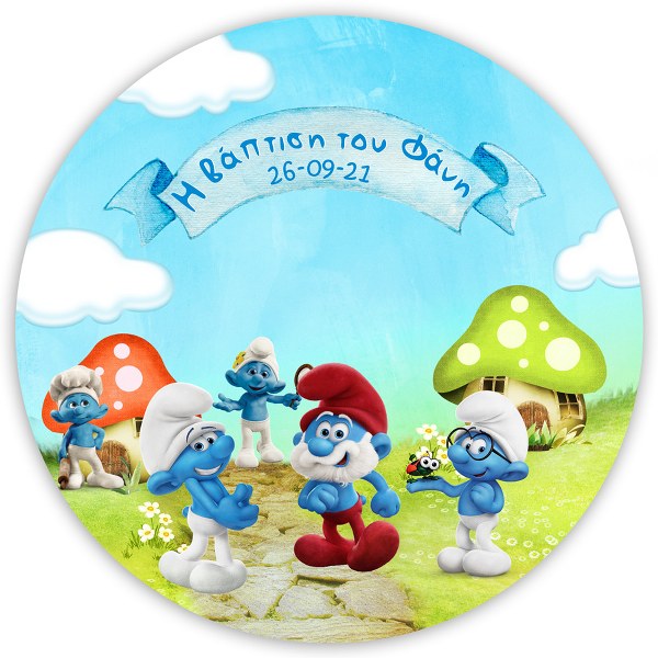 Στρογγυλή αφίσα με θέμα Στρουμφάκια και εκτυπωμένο το μήνυμα που θέλετε, για να διακοσμήσετε το χώρο της βάπτισης του μωρού σας!