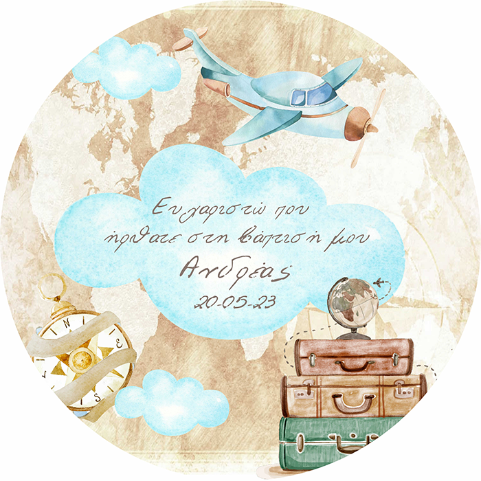 Στρογγυλή αφίσα με θέμα τα Ταξίδια και εκτυπωμένο το μήνυμα που θέλετε, για να διακοσμήσετε το χώρο της βάπτισης του μωρού σας!