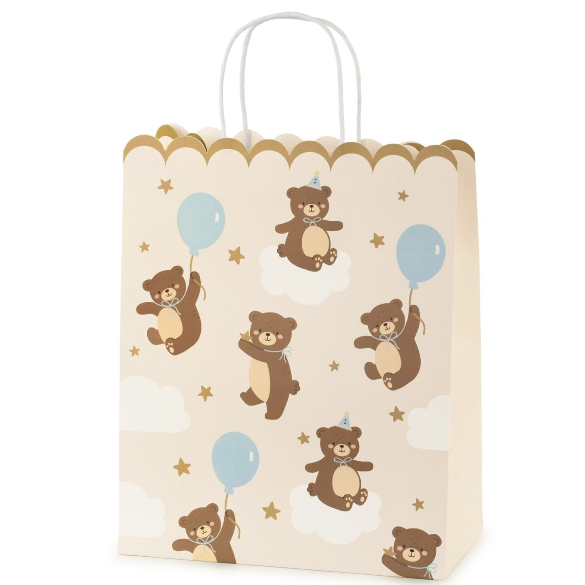 Τσάντα δώρου με χαριτωμένο σχέδιο αρκουδάκι που κρατάει γαλάζιο μπαλόνι, ιδανική για να συσκευάσετε τα δώρα των καλεσμένων και να προσθέσετε μια γλυκιά πινελιά στα γενέθλια ή την βάπτιση!