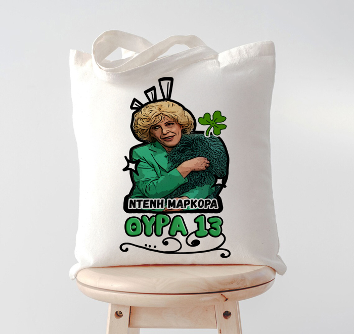 Τσάντα για να κρατάς με την πολυαγαπημένη Ντένη Μαρκορά την στιγμή που δηλώνει το όνομα και την θρησκεία της Παο θύρα 13 και να μοιράζεις χαμόγελα.
