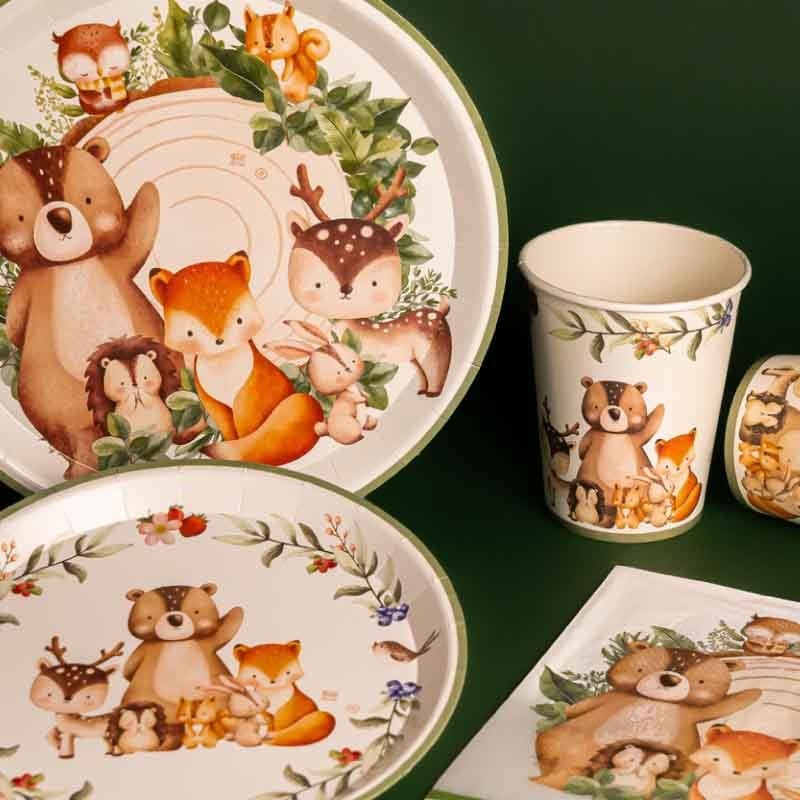 Χάρτινα πιάτα πάρτι με ζωάκια του δάσους — αλεπουδίτσες, σκιουράκια και άλλα χαριτωμένα πλασματάκια έρχονται να γεμίσουν το τραπέζι με χαρά! Ιδανικά για παιδικά γενέθλια και θεματικά πάρτι.