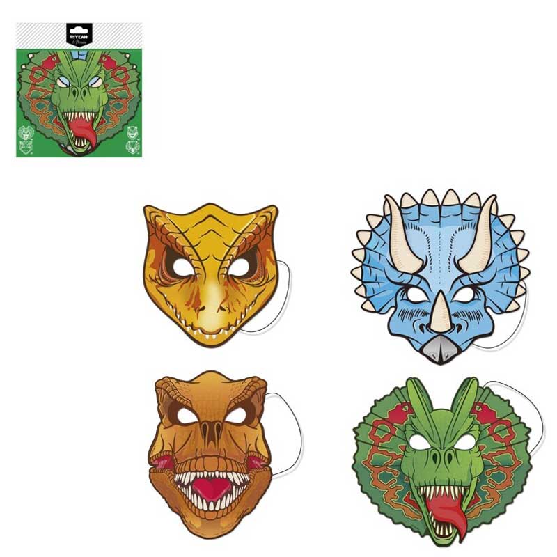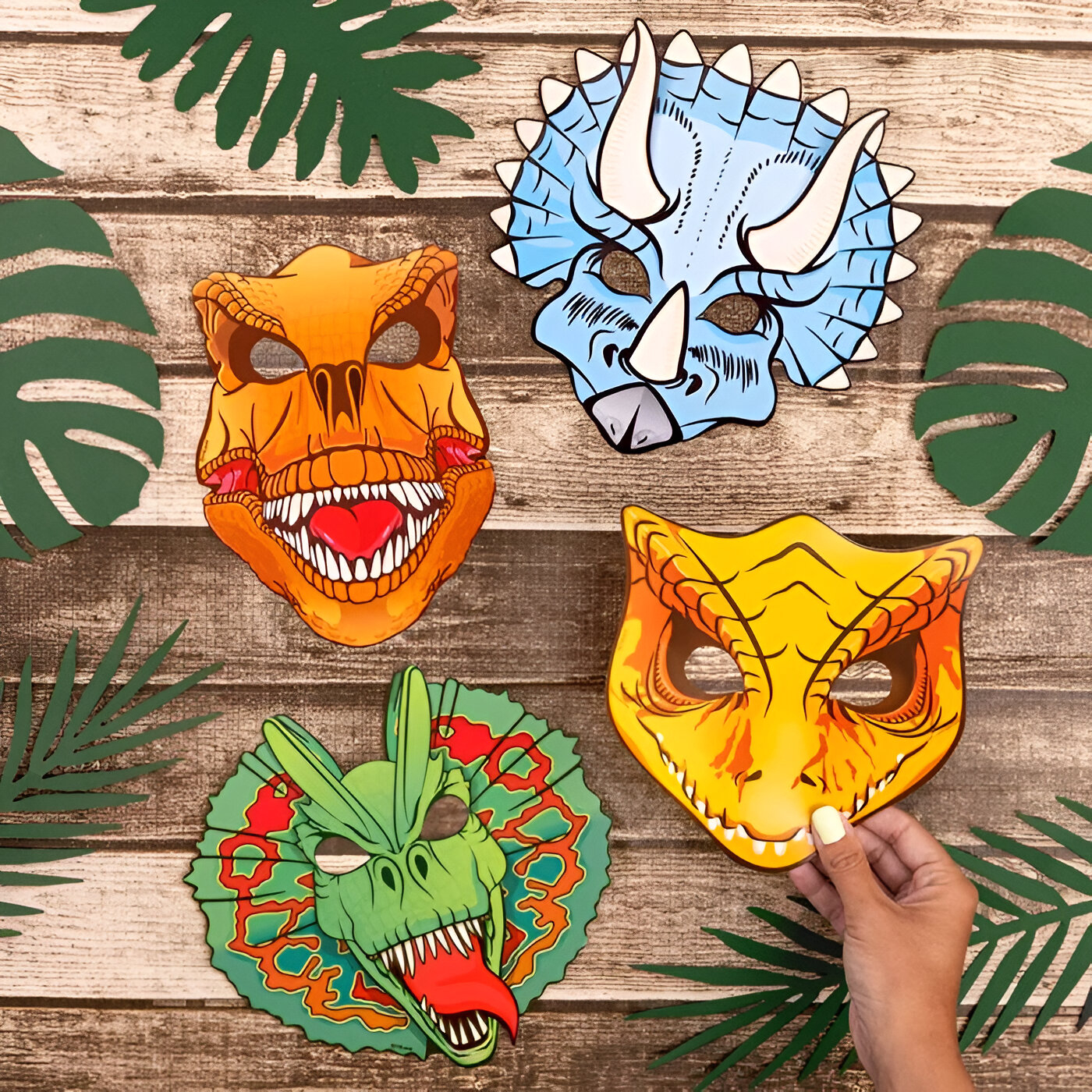 Χάρτινες Μάσκες με 4 διαφορετικά είδη δεινοσαύρων, για να μεταμφιεστούν και να διασκεδάσουν οι μικροί καλεσμένοι του πάρτυ!