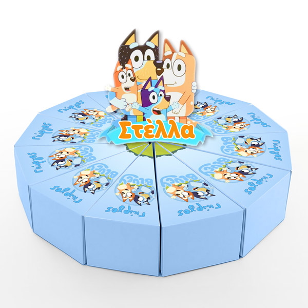 Χάρτινη τούρτα με θέμα Bluey, με το όνομα του παιδιού & εντυπωσιακό design. Η χάρτινη τούρτα αποτελείται από 12 ξεχωριστά κομμάτια, τα οποία όταν συναρμολογηθούν σχηματίζουν έναν ολοκληρωμένο κύκλο – μια εντυπωσιακή παρουσίαση για κάθε είδους εκδήλωση. Κάθε κομμάτι είναι σχεδιασμένο σαν φέτα τούρτας και λειτουργεί ταυτόχρονα ως κουτάκι, ιδανικό για γλυκά ή μικρά δωράκια.