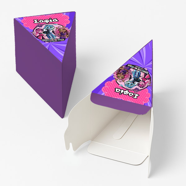 Χάρτινη τούρτα με θέμα Monster High, με το όνομα του παιδιού & εντυπωσιακό design. Η χάρτινη τούρτα αποτελείται από 12 ξεχωριστά κομμάτια, τα οποία όταν συναρμολογηθούν σχηματίζουν έναν ολοκληρωμένο κύκλο – μια εντυπωσιακή παρουσίαση για κάθε είδους εκδήλωση. Κάθε κομμάτι είναι σχεδιασμένο σαν φέτα τούρτας και λειτουργεί ταυτόχρονα ως κουτάκι, ιδανικό για γλυκά ή μικρά δωράκια.