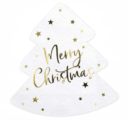 Λευκές σχηματικές χαρτοπετσέτες με Χριστουγεννιάτικο Δέντρο και χρυσή μεταλλική εκτύπωση Merry Christmas. Κάντε το γιορτινό τραπέζι ακόμα πιο όμορφο!