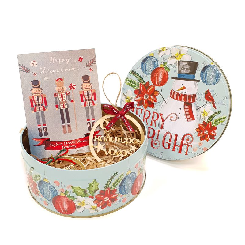 - τσίγκινο κουτάκι Season’s Greetings (διάμετρος: 15 cm). Το σχέδιο το κουτιού είναι χριστουγεννιάτικο, ποικίλλει και η επιλογή του γίνεται τυχαία