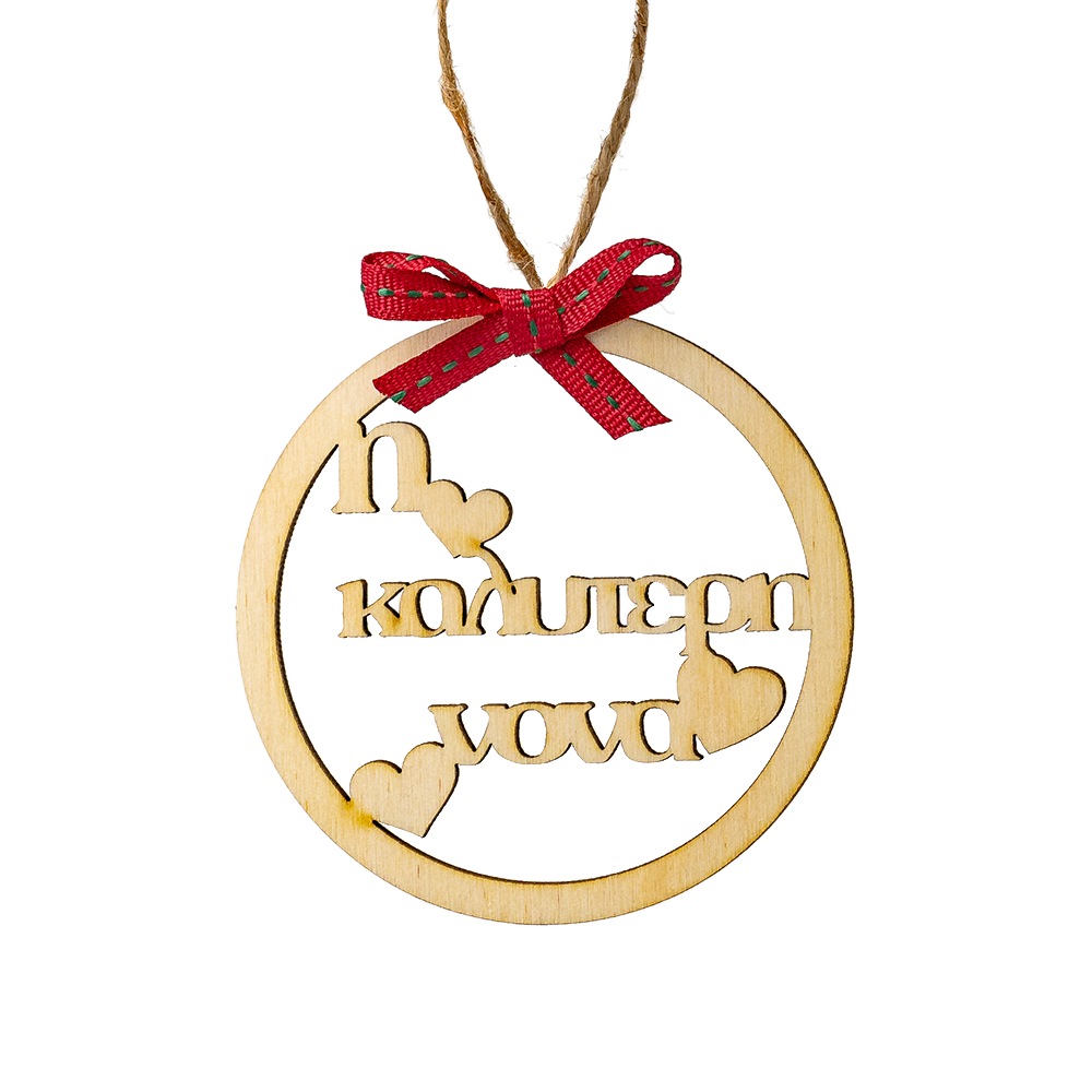 - 1 ξύλινο χριστουγεννιάτικο στολίδι με μήνυμα “Η καλύτερη Νονά” 8 εκ