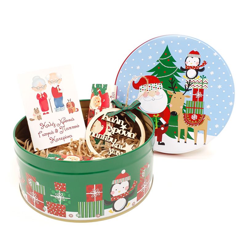 - τσίγκινο κουτάκι Season’s Greetings (διάμετρος: 15 cm). Το σχέδιο το κουτιού είναι χριστουγεννιάτικο, ποικίλλει και η επιλογή του γίνεται τυχαία