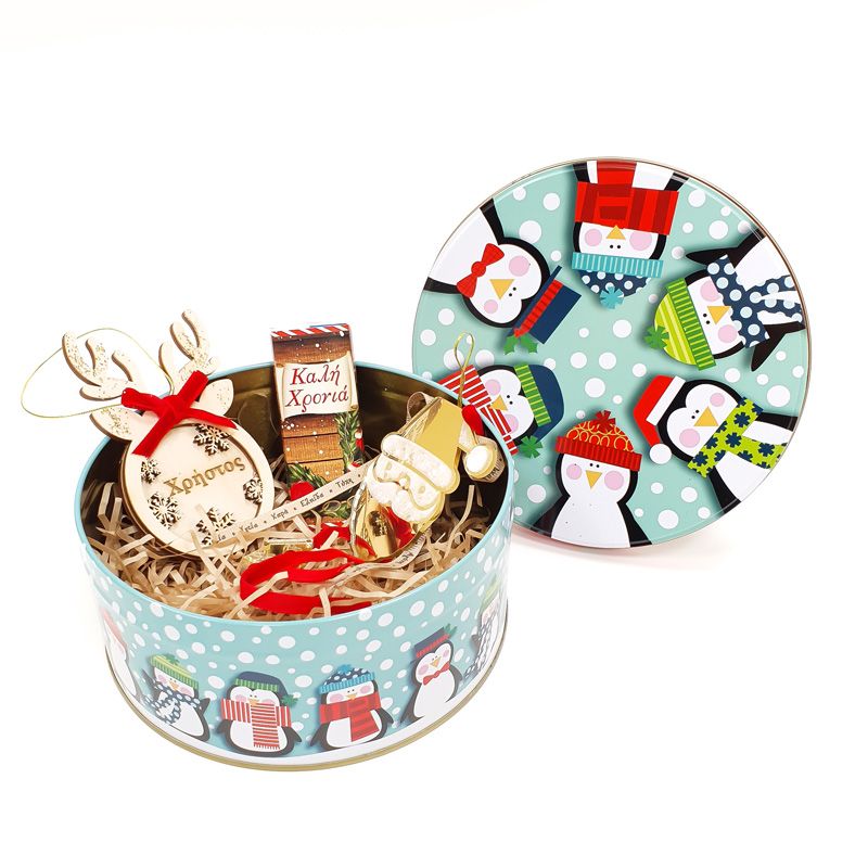 - τσίγκινο κουτάκι Season’s Greetings (διάμετρος: 15 cm). Το σχέδιο το κουτιού είναι χριστουγεννιάτικο, ποικίλλει και η επιλογή του γίνεται τυχαία