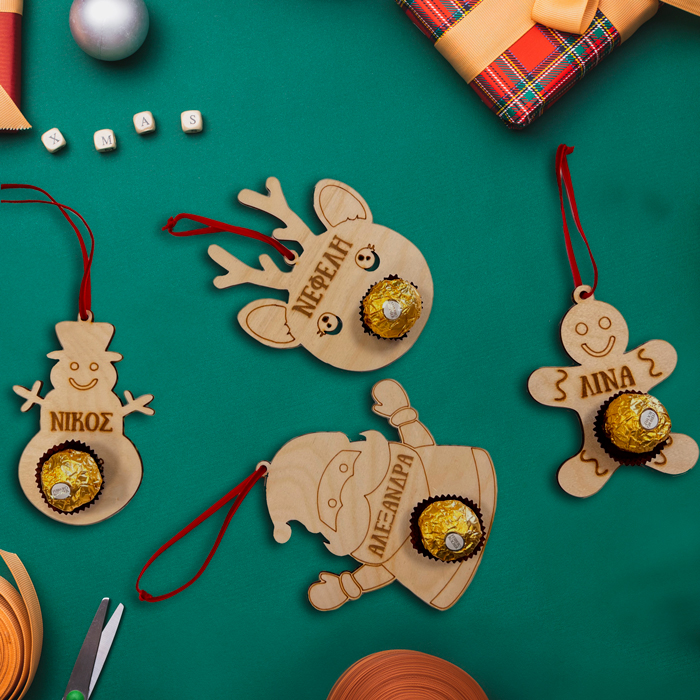 - Tα στολίδια με σοκολατάκι είναι ξύλινα με εκτύπωση υψηλής ποιότητας με κορδέλα σε 4 διαφορετικά σχέδια
